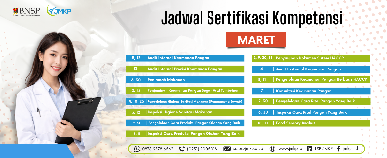 LSP JMKP didirikan atas prakarsa Asosiasi Profesi Keamanan Pangan (APKEPI) dengan dukungan Badan Pengawas Obat dan Makanan (BPOM), Kementerian Perindustrian, dan Kementerian Pertanian. JMKP telah mendapatkan lisensi Badan Nasional Sertifikasi Profesi (BNSP) untuk melaksanakan Sertifikasi Kompetensi bidang Jaminan Mutu dan Keamanan Pangan bagi...